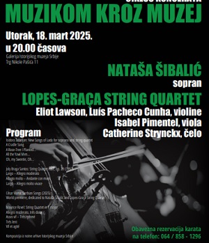 Историјски музеј Србије и удружење „UNICA ART” имају задовољство да Вас позову да у уторак 18. марта у 20 часова присуствујете концерту сопрана Наташе Шибалић и португалског гудачког „Квартета Лопез-Граса”, тринаестом концерту класичне и популарне музике у оквиру пете сезоне циклуса „Музиком кроз музеј”. Концерт се одржава под покровитељством Министарства културе Републике Србије и Секретаријата за културу града Београда. Гудачки „Квартет Лопез-Граса” из Лисабона је током 20 година постојања, које прославља управо ове 2025. године, редовно присутан на концертним подијумима у Португалу и иностранству. Током ове посебне годишњице наступаће на три различите турнеје, у три различите земље и на три различита континента, и интегрисаће у свој репертоар три различите културне баштине: Бразила, Мозамбика и Србије. Сви концерти ће бити изведени и у Португалу у облику међукултурног моста. Концертом у Београду, којим почиње турнеја у Србији, представиће се публици заједно са сопраном Наташом Шибалић, са којом сарађују од првих година оснивања. Гудачки „Квартет Лопез-Граса” чине виолисткиња Изабел Пиментел, виолончелисткиња Катрин Стринкс и виолинисти Елиот Лавсон и Луис Пачеко Куња. На програму су композиције Исидоре Жебељан, Џолија Браге Сантоса, Цезара Вијане и Мориса Равела, а поред наведених, биће изведена и композиција изненађења из нотне архиве Историјског музеја Србије. Због ограниченог броја места, заинтересовани грађани, који желе уживо да присуствују концерту, морају да резервишу место на телефон 064/ 858- 1296. Резервације се примају сваког дана, осим понедељка, у периоду од 12 до 19 часова. Цена карте износи 250 РСД. Сви који нису у могућности да присуствују концерту или благовремено не резервишу место, биће у прилици да погледају концерт на ју-тјуб каналу Историјског музеја Србије. Такође, на ју-тјуб каналу Историјског музеја Србије се налазе и сви снимци концерата претходних сезона циклуса „Музиком кроз музеј”. У петој сезони публику очекују концерти реномираних домаћих музичких уметника и младих талената, а поред њих наступиће и гости из иностранства. Подсећамо Вас да су у Историјском музеју Србије презентоване изложба „Чекајући сталну поставку” и гостујућа изложба „Свет у слици – Слика света”, које заинтересовани грађани могу да посете свакога дана, осим понедељка, у периоду од 12 до 20 часова (продаја улазница до 19 часова).